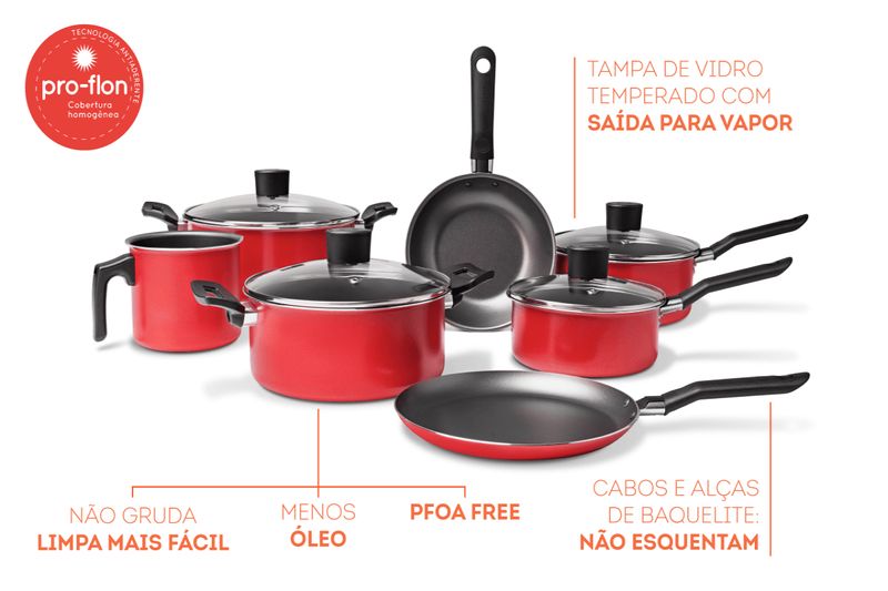 Sua cozinha merece o mais funcional e compacto conjunto de panelas do Brasil, o JJogo de Panelas Brinox Antiaderente Pro-Flon 7 Peças Garlic Vermelho. O Jogo de panelas 7 peças Garlic possui estrutura em alumínio, cozinha por igual e muito rápido, consumindo menos energia. Seu revestimento antiaderente pro-flon não deixa o alimento grudar, facilita a limpeza e é livre de metais pesados e elementos prejudiciais a saúde (PFOA free). Como todo produto de qualidade Brinox, possui classificação A no Inmetro. É composto por 1 caçarola de 22 cm, 1 caçarola de 20 cm, 1 panela de 18 cm, 1 panela de 16 cm, 1 tapioqueira de 22 cm, 1 fervedor de 12 cm e uma frigideira de 18 cm. O conjunto, funcional, prático e de grande resistência pode ser utilizado nos fogões à gás (comum), vitrocerâmico e elétrico, com a mesma durabilidade e eficiência. A linha Garlic possui corpo de 1,2 mm de espessura em alumínio com pintura antiaderente garantindo a durabilidade do produto. Seus cabos, alças e puxadores são feitos em baquelite, não esquentam e proporcionam um toque confortável e ergonômico das panelas. Suas tampas são de vidro temperado com bordas em aço inox e saída de vapor, facilitando a visibilidade durante o cozimento. A Brinox está sempre inovando e pensando no melhor para as suas panelas sejam elas comuns ou de pressão, além dos demais utensílios de apoio ao seu dia a dia. Afinal, você merece os produtos Brinox na sua casa! O Grupo Brinox, com desenvolvimento e produção no Brasil, é um dos maiores fabricantes de utilidades domésticas do Brasil. Localizado na cidade de Caxias do Sul, na Serra Gaúcha e expandindo permanentemente a sua atuação no mercado externo, o Grupo Brinox possui canais de exportação nos cinco continentes e atua ativamente em mais de vinte países. Através de suas marcas, Brinox, Coza e Haus Concept, oferece um mix de mais de 6 mil itens, e segue com seus planos de expansão como um grande participante no mercado de utilidades domésticas.