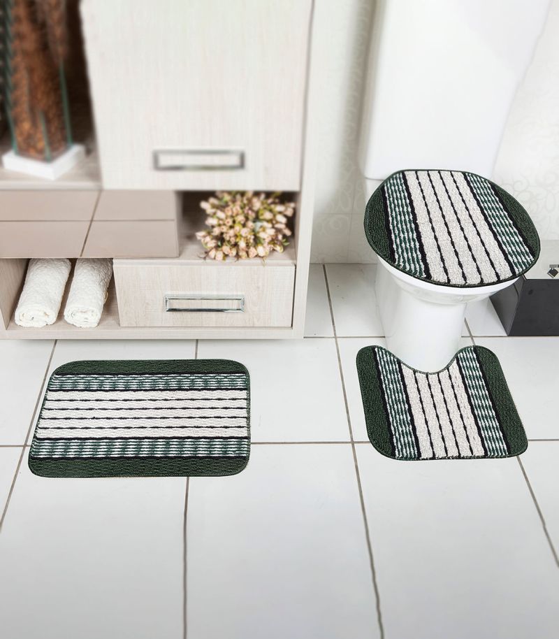 Jogo De Tapetes Composto por 3 peças: 1 tapete para pia, 1 tapete para vaso e 1 tapete para tampa do vaso sanitário confeccionado em polipropileno. Deixe Seu Banheiro Sempre Organizado e Charmoso.