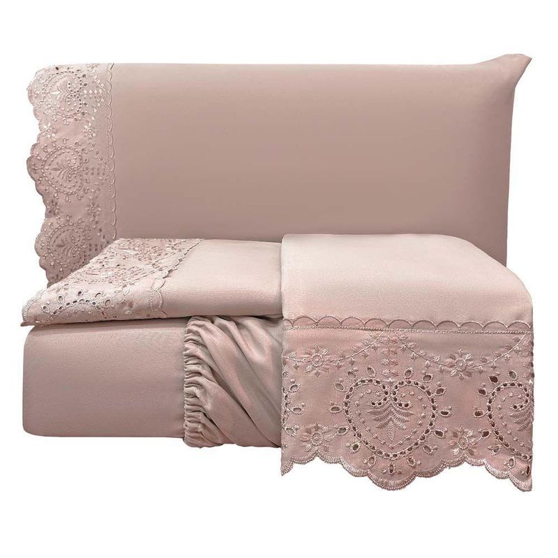 Jogo De Cama Lençol Bella Casal 4 Peças Micropercal 300 Fios Bordado Inglês Macio - Rosê - 100% Poliéster