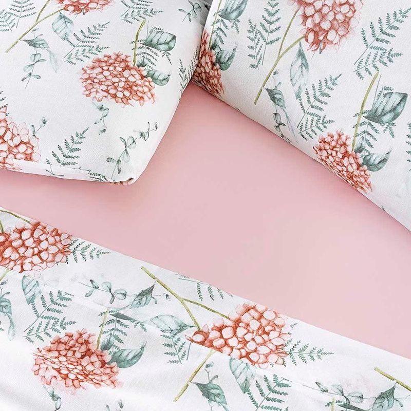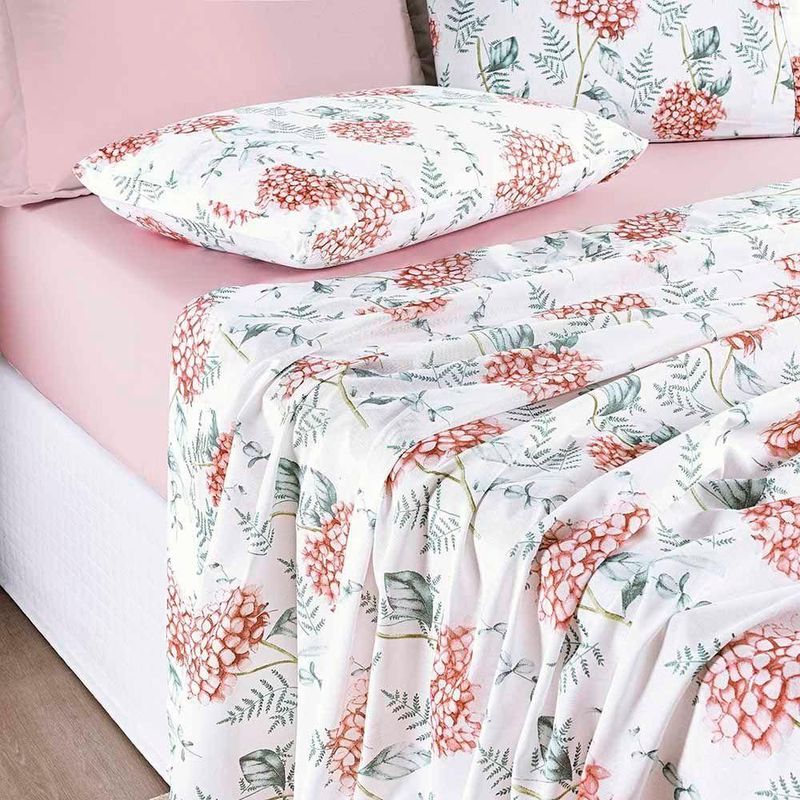 Jogo De Cama Lençol Maggy Casal 4 Peças Percale 200 Fios Estampado - Hortencia Floral Rosa - 80% Algodão / 20% Poliéster