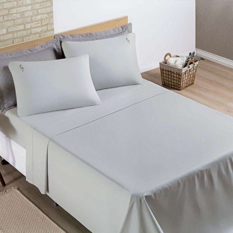 Jogo De Cama Lençol Percal 200 Fios 100% Algodão Bordado Liana Casal Padrão 04 Peças - Cinza