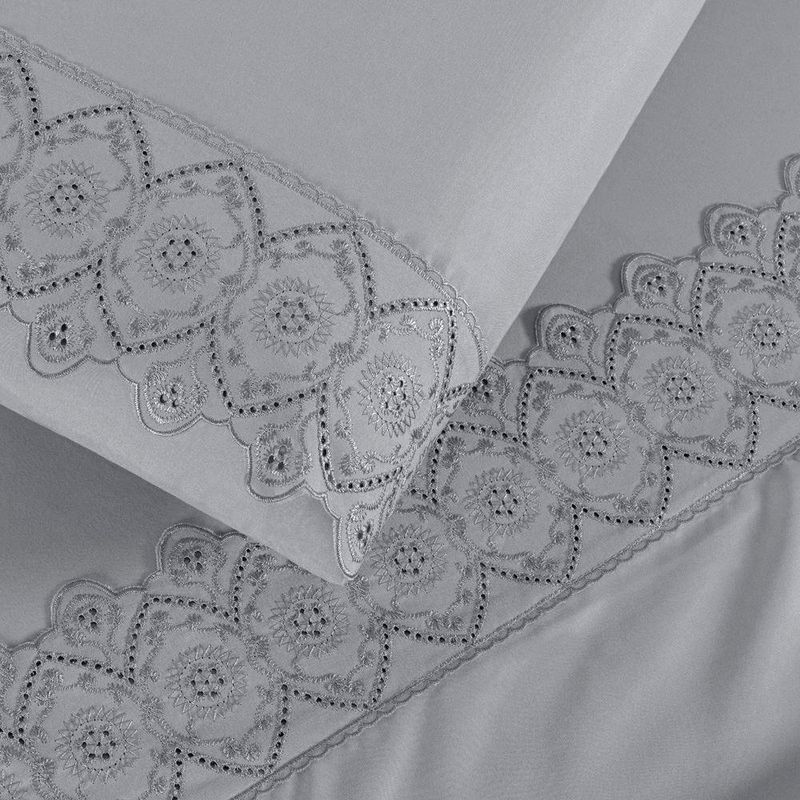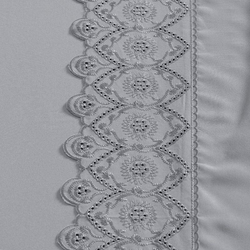 Tecido: Micropercal 200 fios com detalhe em bordado inglês nas fronhas e no lençol de cima