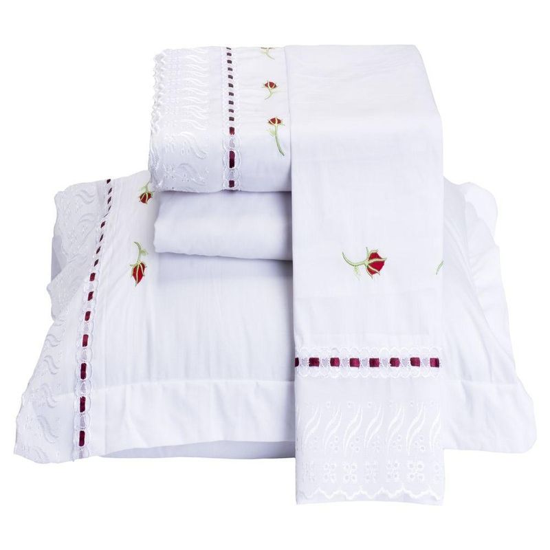 A Linha Felicitá da Vilela Enxovais é sofistica e muito delicada com detalhes em bordados que deixam o ambiente aconchegante e acolhedor. Fabricada com um alto controle de qualidade que proporcionam acabamentos perfeitos e detalhes primorosos em bordados. Confeccionado em tecido Percal 200 fios em algodão com vira e fronha com detalhes em bordado com lese e passa fita. Composição: 1 lençol de cima com vira bordada 2,60m x 2,40m 1 lençol de baixo com elástico para colchão de 1,98m x 1,58m x 40cm de altura 2 fronhas bordadas 70cm x 50cm