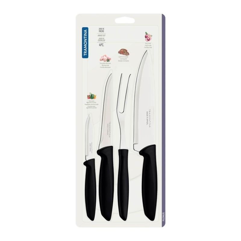 O jogo de facas Tramontina Plenus com lâminas em aço inox e cabos de polipropileno preto 4 peças é perfeito para diferentes cortes na cozinha. As quatro peças atendem diferentes usos: desde o preparo dos alimentos ao serviço de mesa. Produzidas com cabos de polipropileno e lâminas em aço inox, são resistentes e fáceis de manusear, podendo ser utilizadas na lava louças. O design moderno permite que elas estejam em preparações que vão desde o café da manhã ao jantar. A escolha certa para suas necessidades na cozinha.