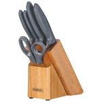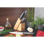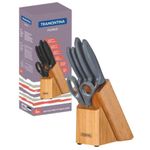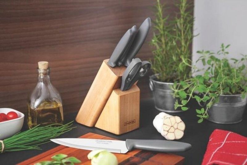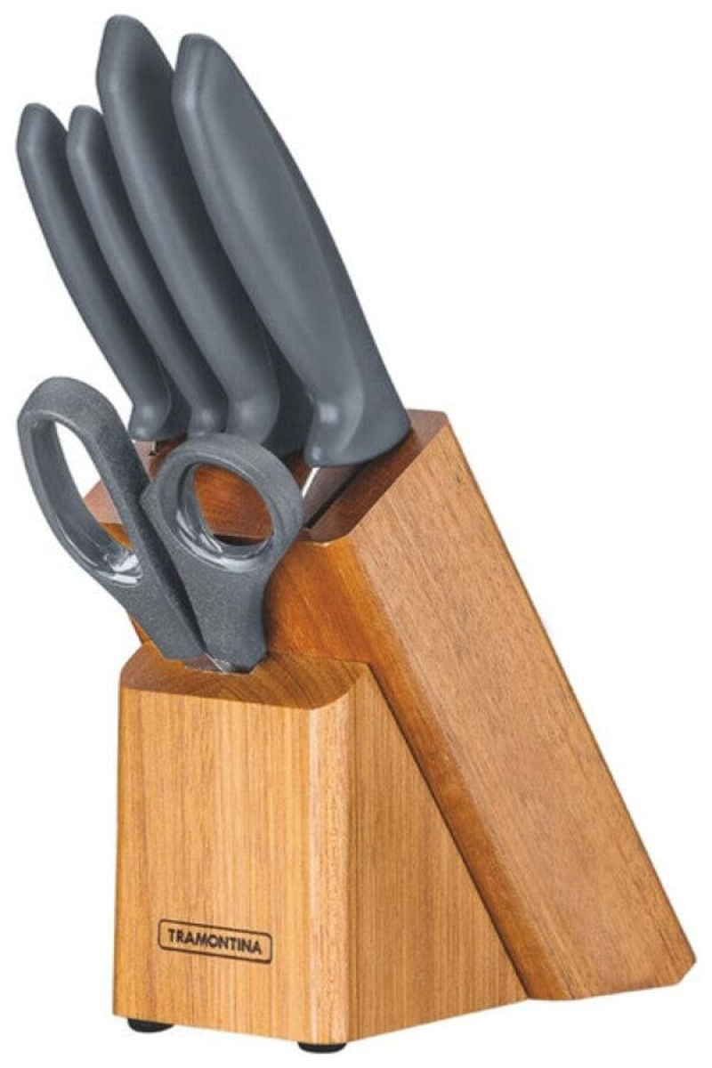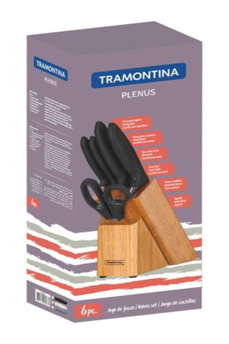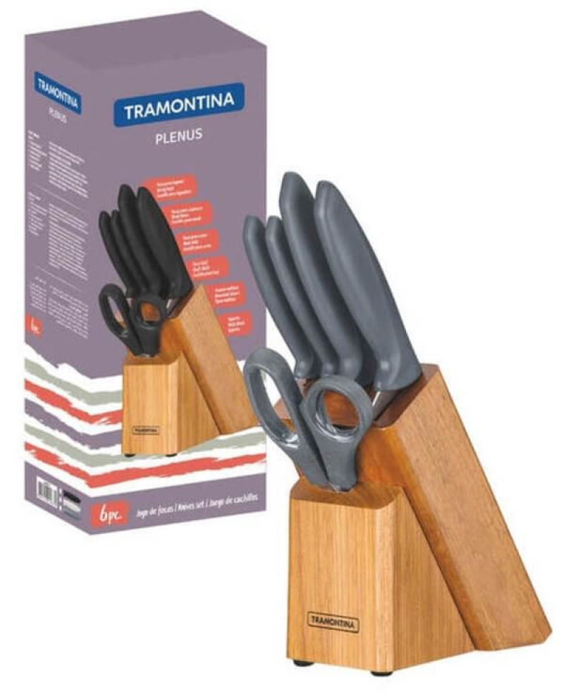 Completo, o jogo de facas Tramontina Plenus com lâminas em aço inox cabos de polipropileno cinza e suporte de madeira 6 peças da linha Plenus vai deixar seu dia a dia mais prático. São cinco facas versáteis e modernas, produzidas com cabo em polipropileno Cinza, resistentes e de fácil manuseio. As lâminas são de aço inox e acompanha um suporte de madeira, perfeito para manter sempre a organização das peças. Fáceis de limpar podem ser levados à máquina de lavar louças. São as facas essenciais que atendem diferentes usos desde o café da manhã ao jantar, do churrasco à mesa de queijos.