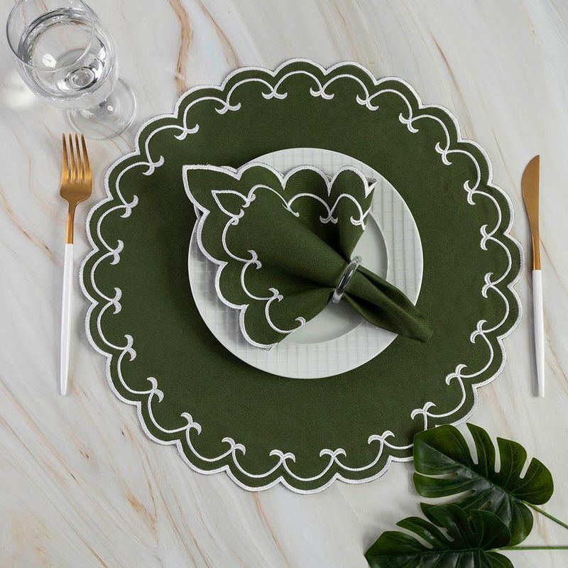 Jogo De Guardanapos Sousplat Americano 12 Peças Bordado Decorativo - Sparta Verde Musgo - 100% Poliéster