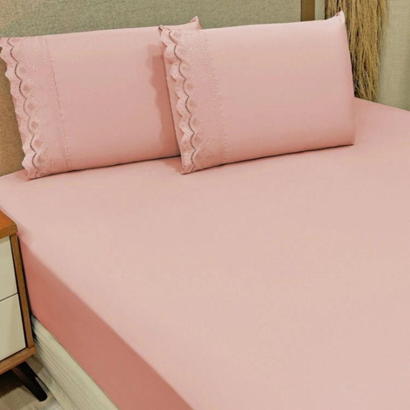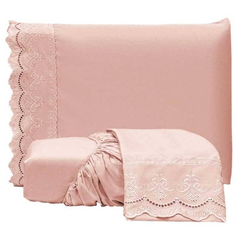 Jogo De Lençol King Bordado Ingles Micropercal 300 Fios Toque De Algodão 3 Peças - Rose