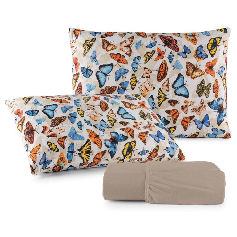 Jogo De Lençol Luar Casal 3 Peças Malha 100% Algodão Estampado - Bege Borboleta