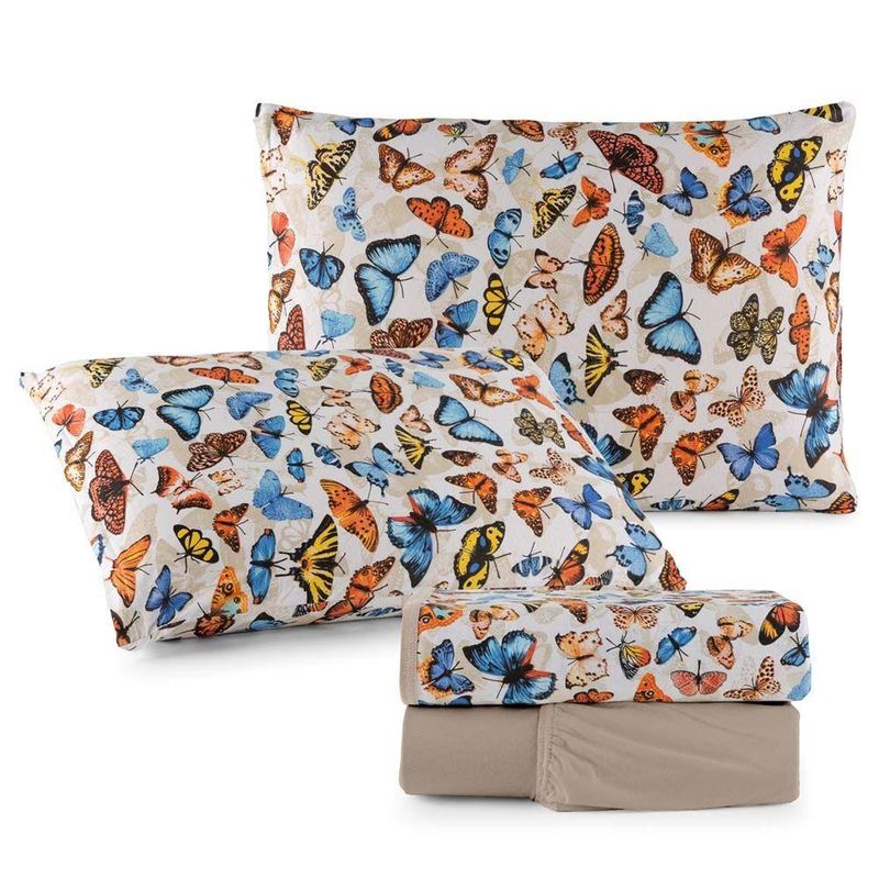 Jogo De Lençol Luar Queen 4 Peças Malha 100% Algodão Estampado - Bege Borboleta