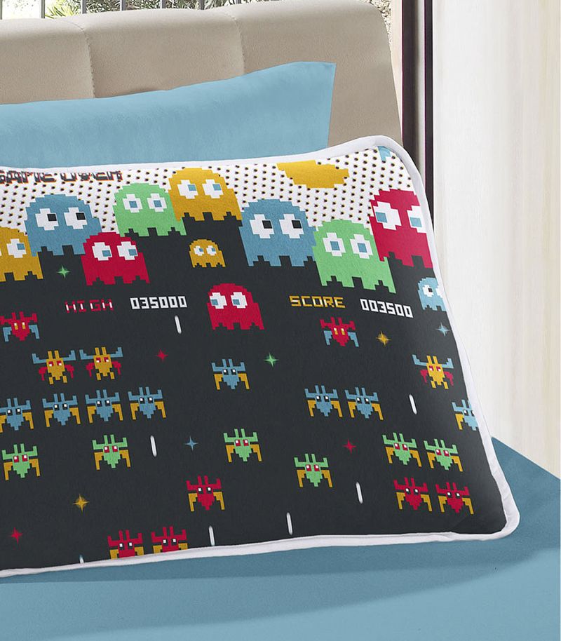 Jogo de Cama Solteiro Game On Inspirado nos jogos e na criançada, a estampa Game On traz elementos divertidos e joviais, que juntos nos fazem lembrar dos melhores games. Fabricado em malha 100% algodão com fio penteado 30/1 120g/m². Possui acabamento delicado, proporcionando harmonia, conforto e estilo para o quarto dos pequenos.