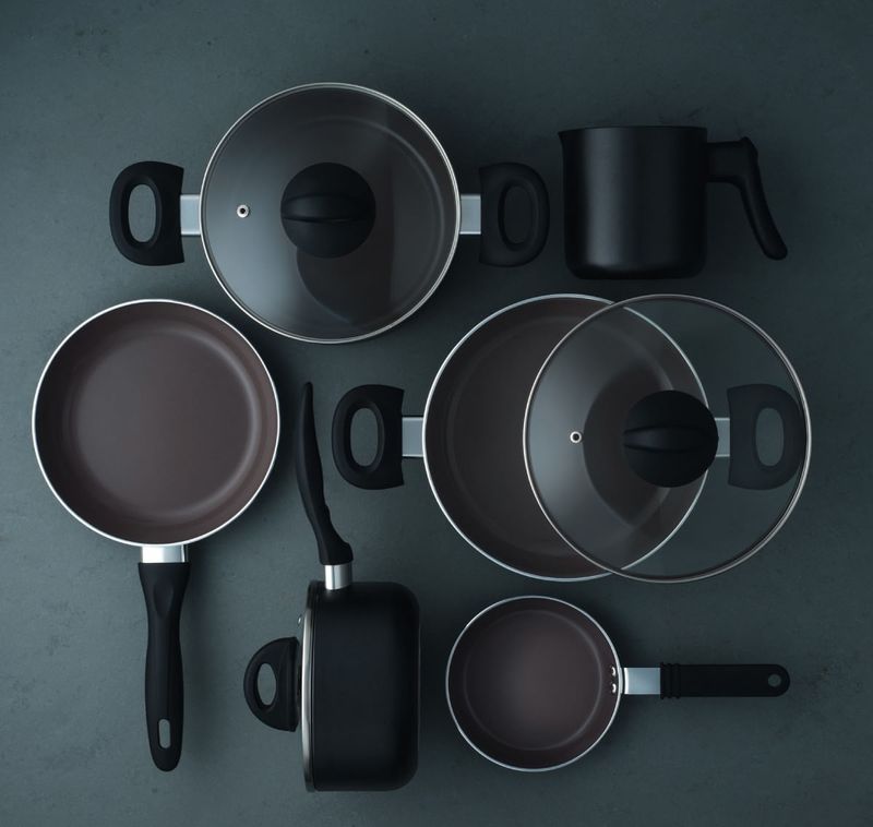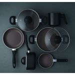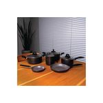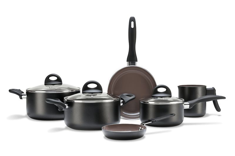 No jogo, as panelas e caçarolas possuem antiaderente Pro Ceramic Premium e a frigideira o revestimento Mineral Resist com partículas de cerâmica ultra resistente ao uso em altas temperaturas.