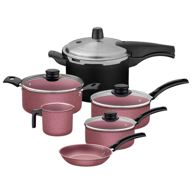 Jogo de Panelas 6 Peças com Panela Pressão TramontinaSeja qual for a receita que você vai preparar, é essencial contar com itens de qualidade, como o jogo de panelas Tramontina Turim e a Panela de Pressão Vancouver em alumínio com revestimento interno e externo em antiaderente Starflon Max. Aptas para uso no dia a dia, suas peças garantem maior segurança e facilidade na hora preparar suas refeições, pois contam com cabos, alças e pegadores em baquelite e nylon e vem com tampas de vidro temperado com borda de aço inox. Você ainda cozinha de maneira rápida e uniforme, sem que os alimentos grudem em sua superfície e tem facilidade na limpeza, pois o corpo das peças tem produção em alumínio com revestimento em antiaderente Starflon Max. Escolha Tramontina e deixe suas tarefas na cozinha, ainda melhores!