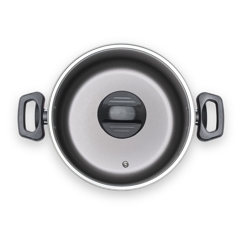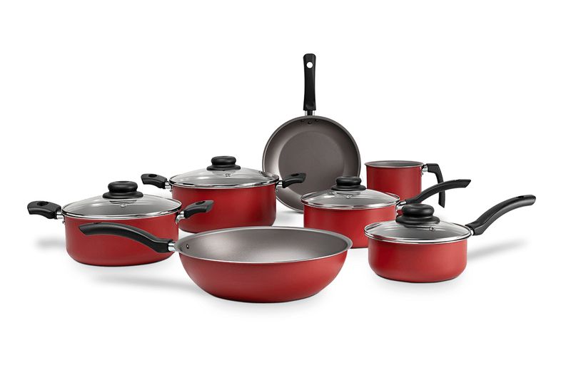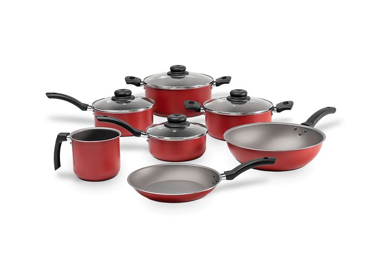 Com estrutura em alumínio que cozinha por igual e mais rápido, tampas de vidro temperado, com saída para vapor e cabos e alças de baquelite que não esquentam, o Jogo de Panelas Brinox Antiaderente Pro-Flon 7 Peça Ruby Vermelho possui antiaderente pro-flon que não gruda, é fácil de limpar e livre de PFOA. Como todas as panelas da Brinox, a linha Ruby possui Classificação A no Inmetro. Disponível na cor preta, uma das cores mais versáteis e práticas para a cozinha, a linha Ruby é uma ótima opção para o dia a dia pois se encaixa bem tanto em ambientes sofisticados quanto nos mais mais simples. Esse conjunto é composto por: Caçarola com Tampa Ø 22 x 10 cm - 3,45 L, Caçarola com Tampa Ø 20 x 9 cm - 2,6 L, Panela com Tampa Ø 18 x 8 cm - 1,9 L, Panela com Tampa Ø 16 x 7 cm - 1,3 L, Wok Ø 26x8 cm - 3 L, Frigideira Ø 22 x 3,5 cm - 0,8 L, Fervedor Ø 12 x 11,5 cm.