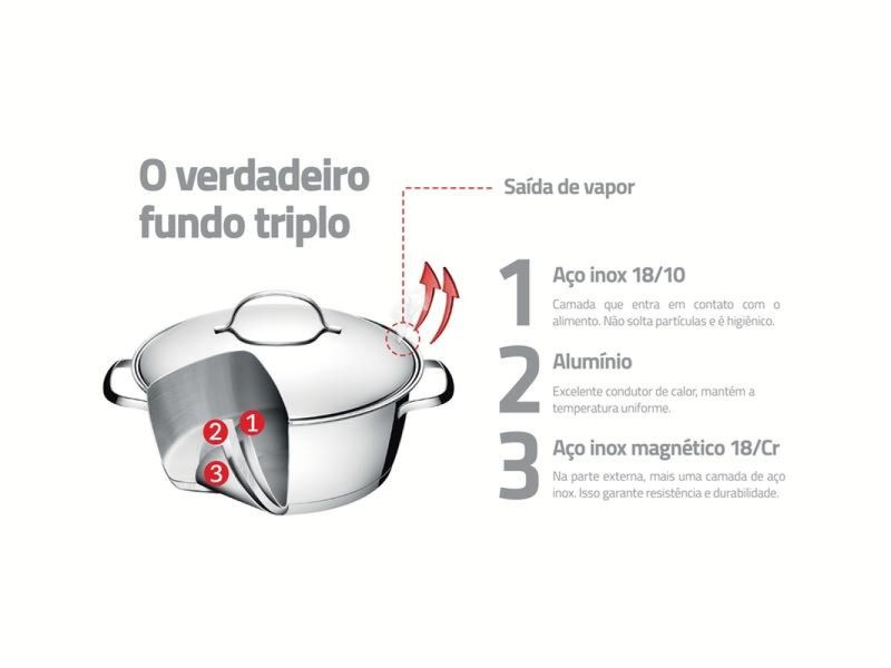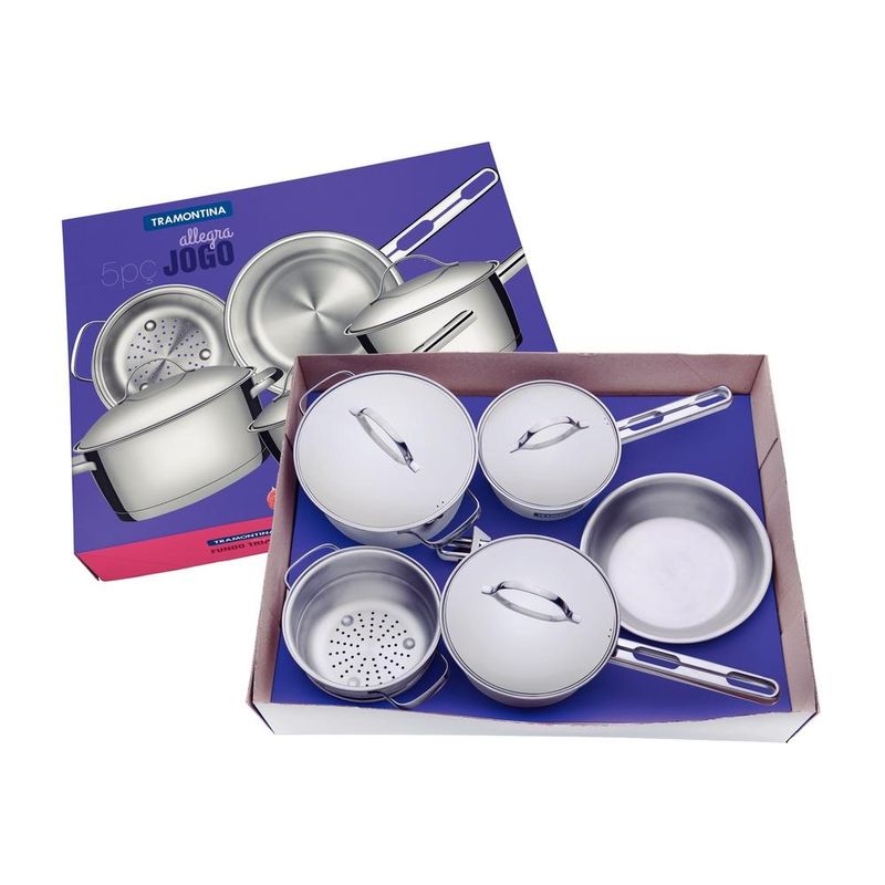 Jogo de Panelas Aço Inox Indução Tramontina 5 Peças Allegra Sua cozinha vai ganhar ajudantes diferenciados com o Jogo de Panelas Tramontina Allegra em Aço Inox com Fundo Triplo e Tampas de Inox 5 Peças da Linha Allegra. Cinco peças perfeitas para auxiliar você nas tarefas do dia a dia, produzidas totalmente em aço inox, elas mantém os alimentos saudáveis já que o material não solta resíduos. Trazem ainda a tecnologia de fundo triplo (aço inox + alumínio + aço inox), que distribui o calor uniformemente, proporcionando um cozimento mais rápido e uniforme, economizando energia e deixando os alimentos aquecidos por mais tempo. Altamente duráveis e higiênicas, são fáceis de limpar devido ao desenho sem cantos. Podem ainda ser lavadas diariamente na máquina de lavar louças. São versáteis, podendo ir ao forno para gratinar ou finalizar pratos na temperatura máxima de 260°C, além de ser utilizadas nos fogões à gás, elétrico, vitrocerâmico e indução. Acompanham tampas com saída de vapor e encaixe perfeito. São ainda peças estilosas com um moderno acabamento em alto brilho, tornando sua cozinha mais charmosa! Descrição do produto Marca: Tramontina Material Aço Inox Cor: Inox Linha Comercial: Allegra Composição / Quantidade: 5 Peças Revestimento Interno: Sem revestimento Tipo de Fogão: Gás, Elétrico, Indução, Vitrocerâmico - resistência elétrica Máquina de Lavar Louça: Sim Composição:
