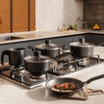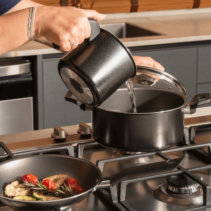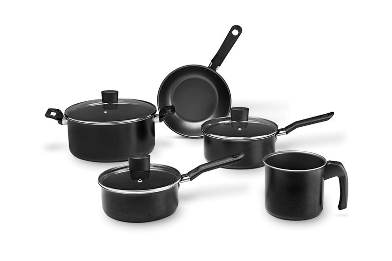 Com estrutura de alumínio que dissipa melhor o calor, cozinhando o alimento por igual, o Jogo de Panelas Brinox Antiaderente Pro-Flon 5 Peças Ebony Preto é composto por uma Caçarola de Ø 20 cm, duas Panelas de Ø 18 Ø 16 cm, uma Frigideira de Ø 20 cm e um Fervedor Ø 12 cm. O revestimento interno é antiaderente, não deixando o alimento grudar, mesmo com uso reduzido de óleo, o que torna a limpeza mais fácil. Os cabos de baquelite não aquecem, tornando o manuseio dos utensílios mais fácil e seguro. Disponível na cor preto poliester, com mais brilho às panelas, o Conjunto de panelas Ebony, traz mais destaque para a sua cozinha.