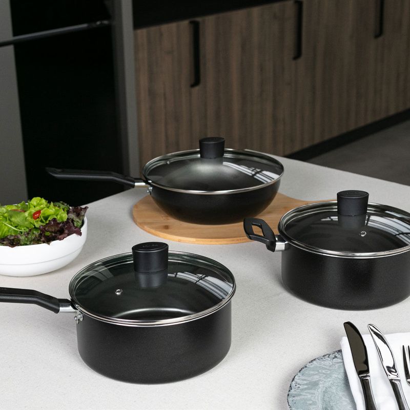 Com estrutura de alumínio que dissipa melhor o calor, cozinhando o alimento por igual, o Jogo de Panelas Brinox Antiaderente Pro-Flon 7 Peças Ebony Preto é composto por duas Caçarola de Ø 24 e Ø 20 cm, duas Panelas de Ø 18 e Ø 16 cm, uma Wok de Ø 24 cm, uma Frigideira de Ø 20 cme um Fervedor de Ø 12 cm. O revestimento interno é antiaderente, não deixando o alimento grudar, mesmo com uso reduzido de óleo, o que torna a limpeza mais fácil. Os cabos de baquelite não aquecem, tornando o manuseio dos utensílios mais fácil e seguro. Disponível na cor preto poliester, com mais brilho às panelas, o Conjunto de panelas Ebony, traz mais destaque para a sua cozinha.