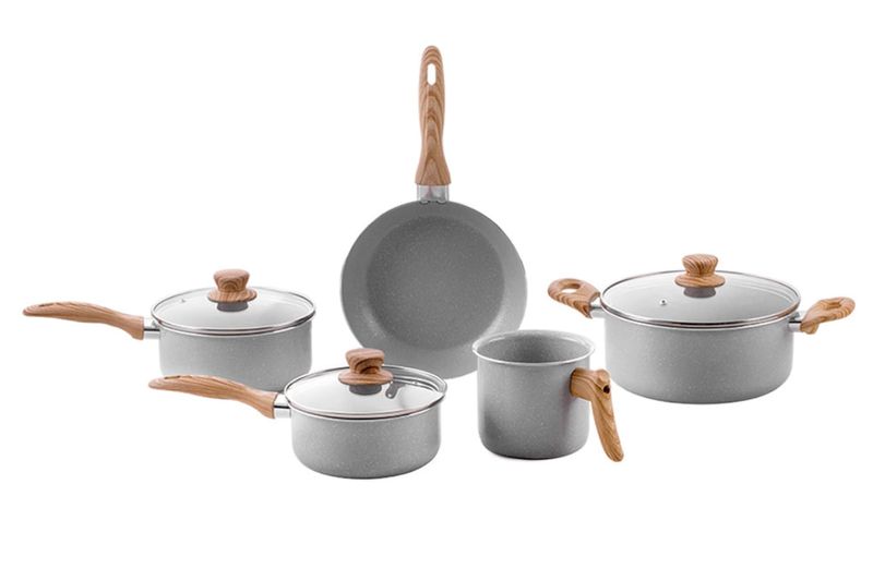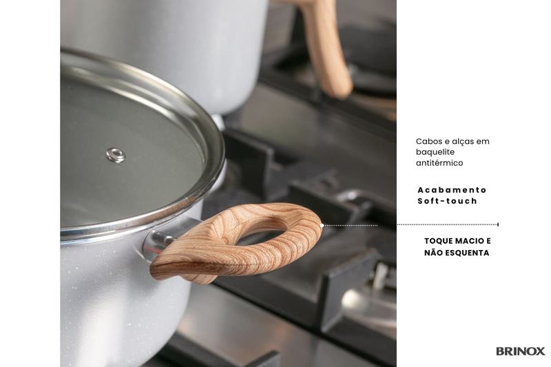 Os cabos, alças e poméis são feitos em baquelite com acabamento soft-touch, proporcionando o manuseio mais confortável e seguro. Com efeito amadeirado, eles deixam as peças ainda mais elegantes.
