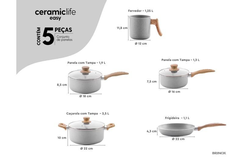 O Jogo de Panelas Brinox Antiaderente Ceramic Life 5 Peças Easy Gris é composto por Caçarola com Tampa Ø 22 x 10 cm - 3,5 L; Panela com Tampa Ø 18 x 8,5 cm - 1,9 L; Panela com Tampa Ø 16 x 7,5 cm - 1,3 L; Frigideira Ø 22 x 4,3 cm - 1,1 L; e Fervedor Ø 12 x 11,8 cm.