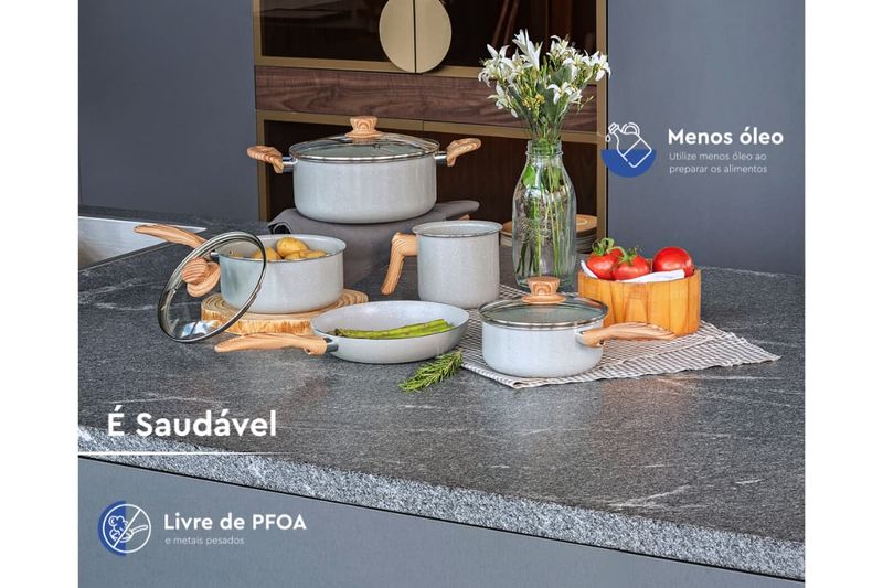 As panelas são revestidas com o antiaderente Pro-Ceramic, o que possibilita cozinhar pratos mais saudáveis, pois reduz o uso de óleo e não deixa o alimento grudar, tornando a limpeza mais prática. Além de agregar maior durabilidade e resistência ao produto.