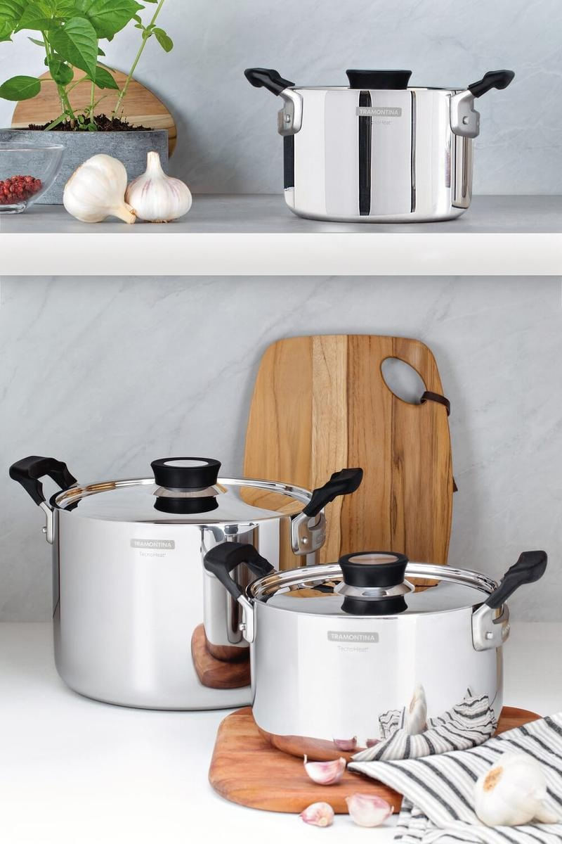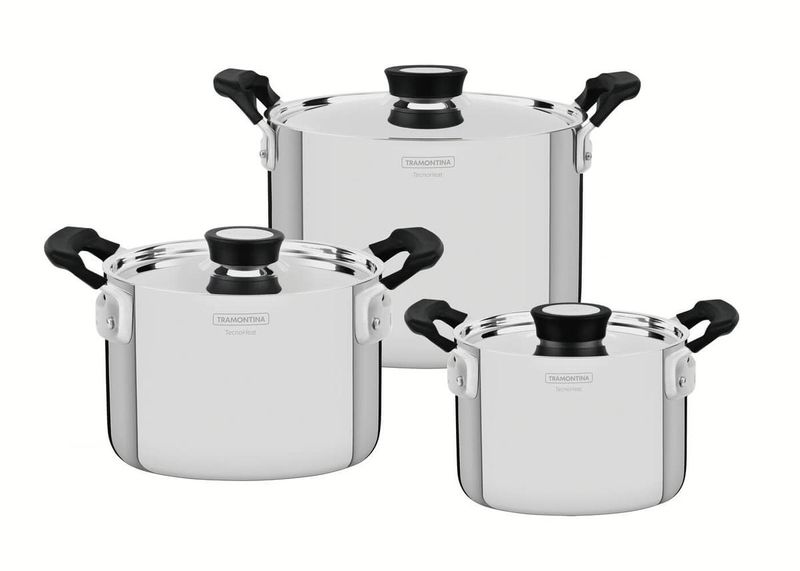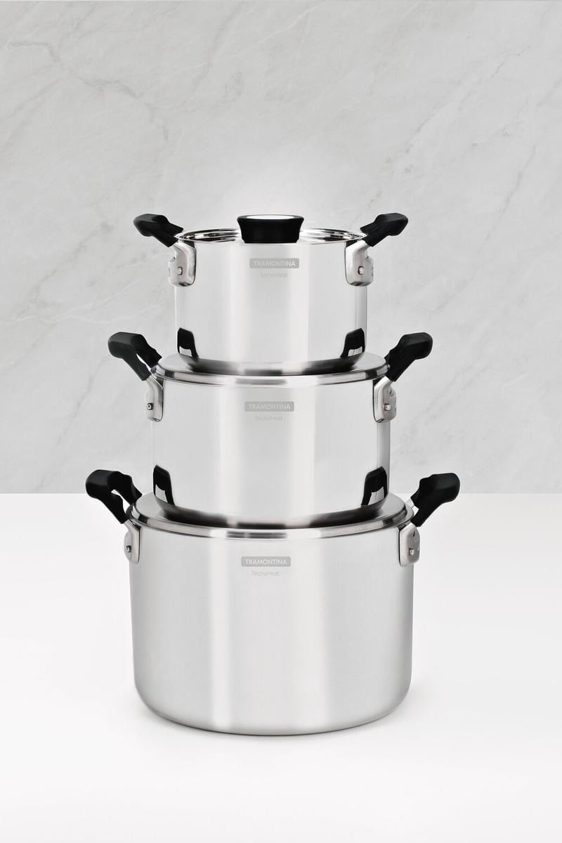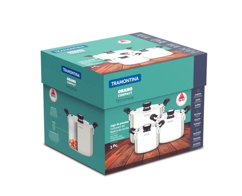 Perfeita para você que quer aproveitar seu espaço, o Jogo de Panelas Grano Compact em Aço Inox com Corpo Triplo e Alças em Silicone Preto 3 Peças Tramontina é a escolha ideal, pois as panelas podem ser inseridas uma dentro da outra. Fabricadas em aço inox, possuem o corpo triplo, alças e pegadores com revestimento em silicone antitérmico. O jogo pode ir em qualquer tipo de fogão: seja a gás, elétrico, vitrocerâmico ou por indução. Sua cozinha merece contar com a beleza e versatilidade das panelas Tramontina!