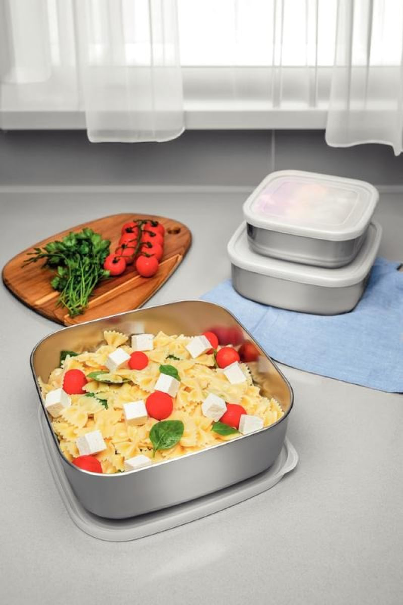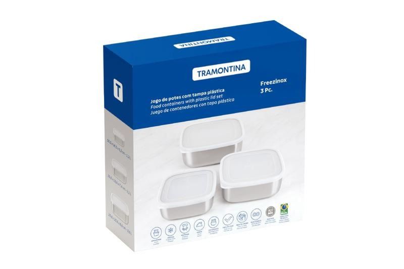 Proporcionar um serviço de qualidade é um verdadeiro presente para o dia a dia. O Jogo de Potes Tramontina Quadrados em Aço Inox com Tampa Plástica, composto por 3 peças da linha Freezinox, oferece beleza e sofisticação para o seu serviço diário. Os potes são fabricados em aço inoxidável, um material altamente durável que mantém suas características originais, preservando a beleza, a higiene e a durabilidade do produto. Seu design limpo, sem cantos, facilita a limpeza. Com acabamento fosco, as tampas possuem vedação perfeita para a conservação dos alimentos. Ideais para preparar e armazenar alimentos, os potes podem ser colocados na geladeira ou no freezer, e são seguros para a máquina de lavar louça, tornando-os lindos e super práticos.