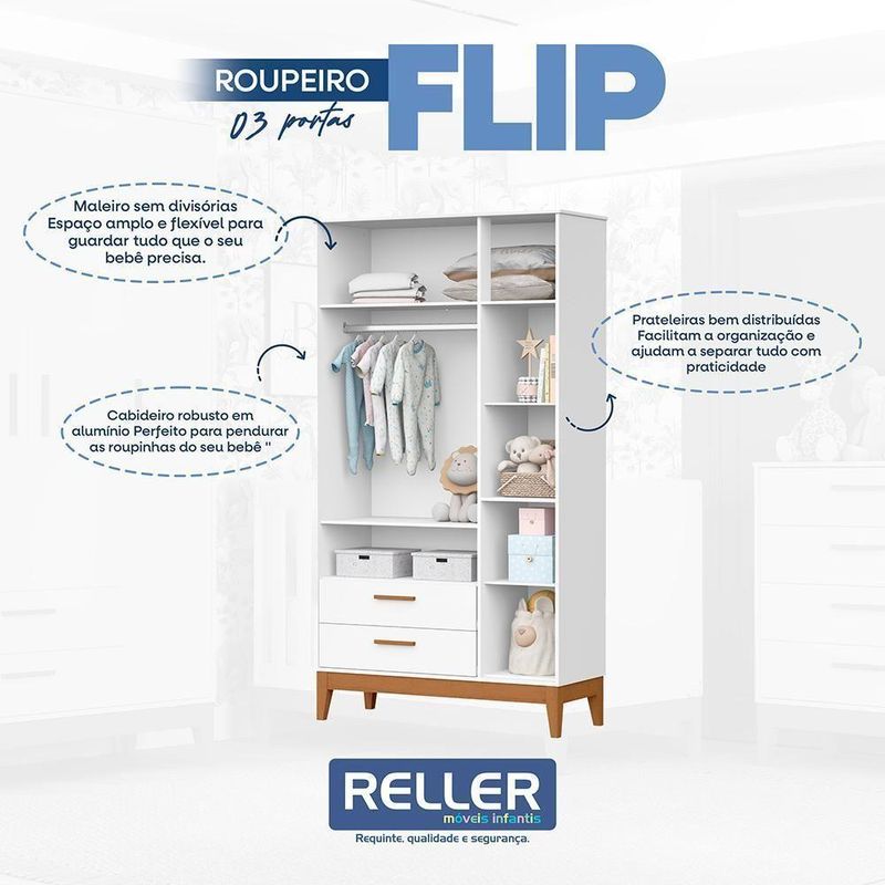 Jogo de Quarto Infantil Flip Guarda Roupa 3 Portas e Cômoda 4 Gavetas - Reller Móveis