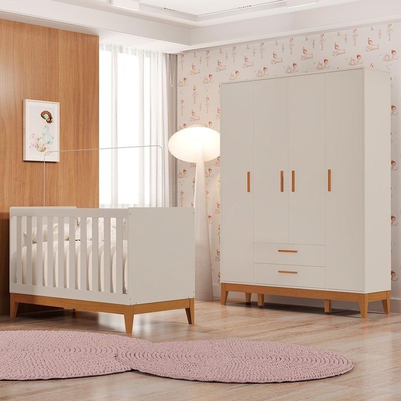 O Jogo de Quarto Infantil Flip é perfeito para trazer funcionalidade, conforto e elegância ao quarto do bebê. O guarda-roupa é produzido em MDF com pintura UV atóxica, possui 4 portas com dobradiças metálicas, 2 gavetas com corrediças telescópicas, cabideiro em alumínio, prateleiras internas bem distribuídas, puxadores revestidos e pés em madeira, garantindo organização e durabilidade. Já o berço americano, que também se transforma em mini cama, conta com estrutura em MDF, acabamento fosco, cabeceira arredondada, grade em madeira, 3 regulagens de altura no estrado, pés em madeira e certificado pelo INMETRO, oferecendo total segurança para o bebê. Compatível com colchão de 70 x 130 cm (não incluso), o conjunto é a escolha certa para acompanhar todas as fases do crescimento do seu pequeno com qualidade e estilo.