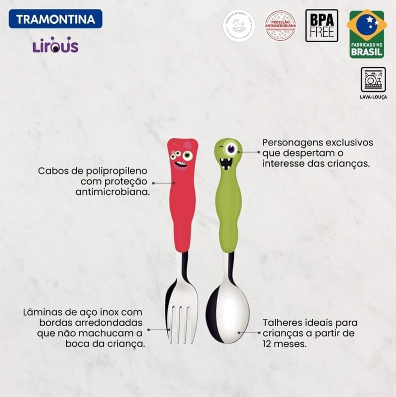 Com o jogo de talheres infantil Tramontina Lirous colorido 02 peças você irá proporcionar uma refeição muito mais agradável e cheia de diversão para os pequenos. Os talheres são produzidos com lâminas em aço inox e cabos de polipropileno, o que lhes proporciona alta resistência e durabilidade. Eles ainda são coloridos e vão estimular ainda mais os sentidos das crianças!Recomendações de Uso:Recomenda-se o uso destes produtos para crianças com 12 meses ou mais.