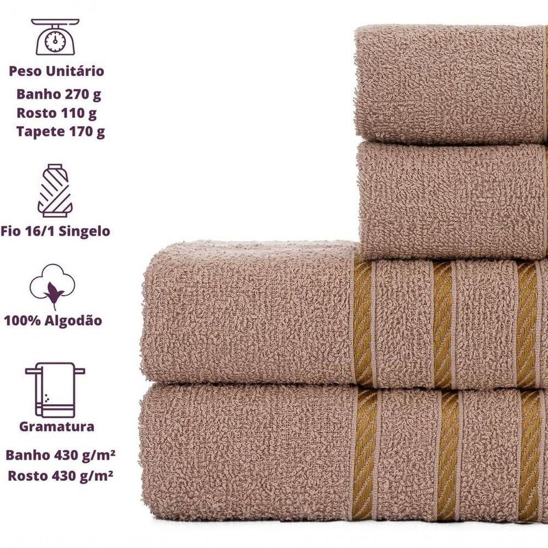 Composição - 2 Toalhas de Banho + 2 Toalhas de RostoGramatura - 330 G/m² Peso Toalha de Banho - 290 a 300 Gramas Peso Toalha de Rosto - 110 a 120 GramassTamanho Toalha de Banho - 70x130 cm Tamanho Toalha de Rosto - 45x70 cm Fio - 16/1