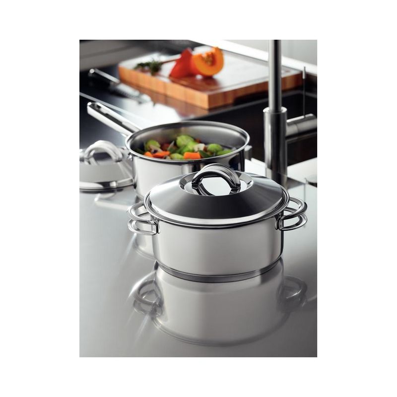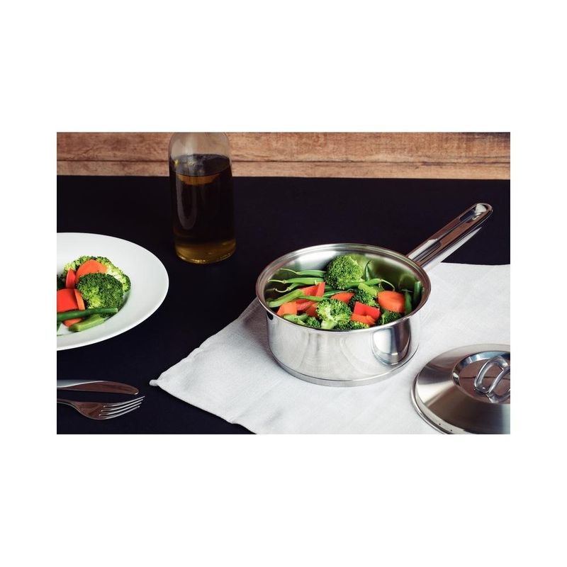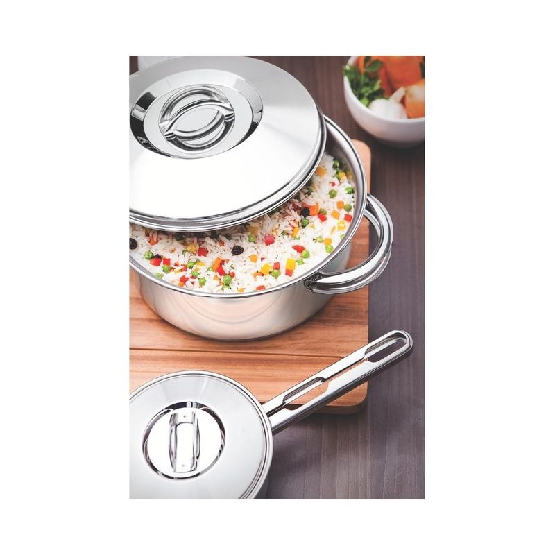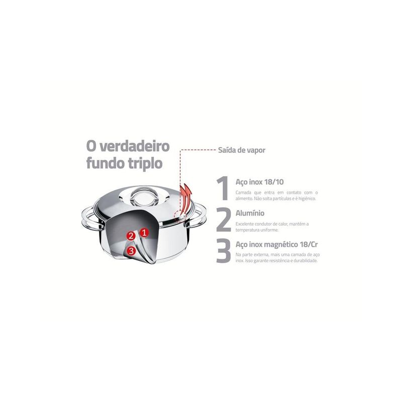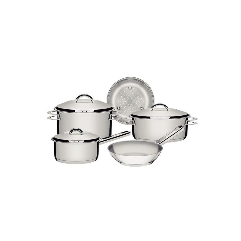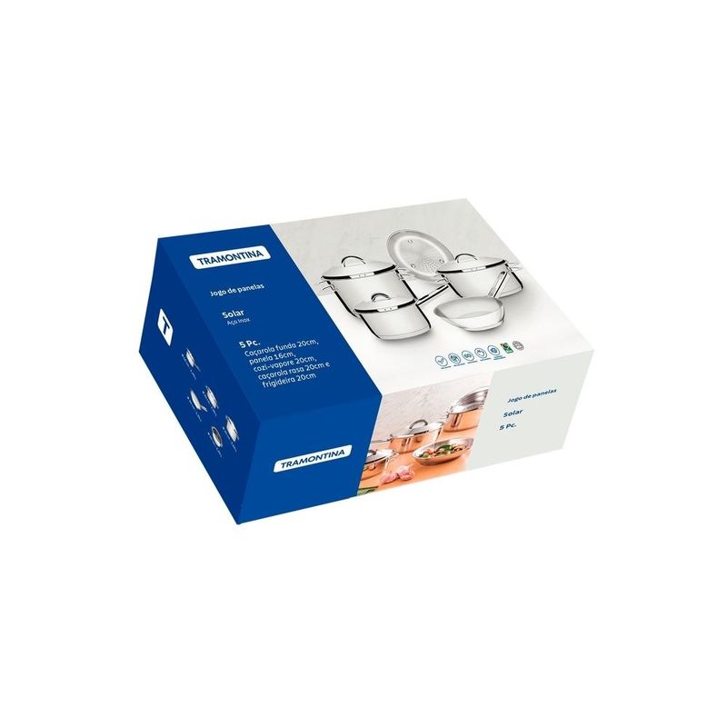 Jogo Panelas Tramontina Solar Inox 5 Peças Fundo Triplo Nada como produtos duráveis e práticos na nossa cozinha. Com o Jogo de Panelas Tramontina Solar em Aço Inox com Fundo Triplo e Tampas de Inox 5 Peças você vai ter peças funcionais perfeitas para auxiliar você nas tarefas do dia a dia. Totalmente produzidas em aço inox, as cinco peças mantém os alimentos saudáveis já que o material não solta resíduos. Trazem ainda a tecnologia de fundo triplo (aço inox + alumínio + aço inox) que distribui o calor uniformemente, proporcionando um cozimento mais rápido e uniforme, economizando energia e deixando os alimentos aquecidos por mais tempo. São peças versáteis que podem ir ao forno para gratinar ou finalizar pratos na temperatura máxima de 260°C e ser utilizadas em diferentes tipos de fogões. São fáceis de limpar devido ao desenho sem cantos, além de poderem ir à máquina de lavar louças diariamente. Além disso, levam mais estiloso para dentro da sua cozinha já que apresentam um moderno acabamento em alto brilho. Acompanham tampas com saída de vapor e encaixe perfeito. Garanta uma cozinha completa com esse jogo de panelas clássico da Tramontina! Descrição do produto Marca: Tramontina Material: Aço Inox Cor: Inox Linha Comercial: Panelas Solar Composição / Quantidade: 5 Peças 01 Caçarola funda 20cm 3,60l 01 Caçarola rasa 20cm 2,9l 01 Cozi-vapore 20cm 2,20l 01 Frigideira 20cm 1,30l 01 Panela16cm 1,4l Revestimento Interno: Sem revestimento Tipo de Fogão: Gás, Elétrico, Indução, Vitrocerâmico - resistência elétrica Máquina de Lavar Louça: Sim Imagens meramente ilustrativas, todos os itens que ambientam o produto não estão inclusos.