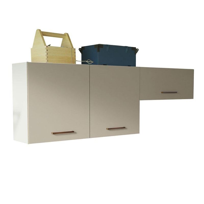 Este Armário Aéreo multiuso é ideal para melhorar a organização dos objetos e utensílios da sua garagem.A distribuição interna é ótima, oferecendo amplo espaço de armazenamento. As portas do aéreo maior possuem amortecedores para o fechamento suave e a porta basculante conta com pistão a gás, que a mantém aberta. Os puxadores possuem alça em alumínio.O acabamento combina os tons branco e Crema. É realizado em Pintura Poliéster com 7 camadas, uma opção ecologicamente correta que preserva a beleza do móvel por muito mais tempo.Medidas totais: