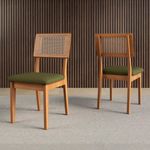 Kit com 2 Cadeiras Dalla Costa fabricadas em 100% MDF com acabamento em pintura UV fosca na cor Freijó, assento estofado em tecido verde de alta qualidade, encosto em palha sintética que garante conforto e estilo, estrutura resistente que suporta até 120 kg, ideal para sala de jantar, cozinha ou ambientes integrados, une design moderno com durabilidade e conforto para valorizar a decoração da sua casa.