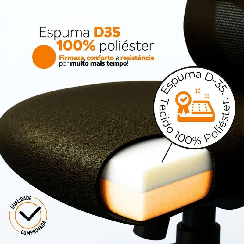 Assento com espuma moldada e base firme para conforto prolongado.