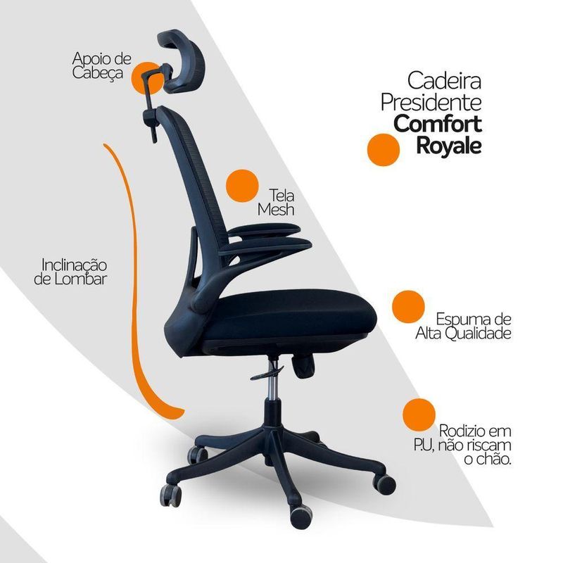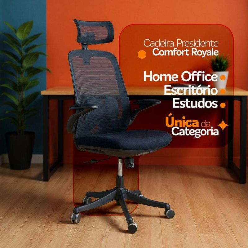Cadeira Presidente Oficial Comfort RoyaleConforto versátil, design executivo e funcionalidades inteligentes.A Comfort Royale foi desenvolvida para quem busca uma cadeira prática, elegante e funcional. Com apoio de cabeça ajustável, braços retráteis e estrutura ergonômica, ela oferece conforto e liberdade para diferentes rotinas de trabalho.Garantia de 2 anos!Destaques do Produto:Apoio de cabeça ajustável 2D, que permite regulagem precisa de altura e ângulo.Estrutura do encosto em PP, leve e resistente.