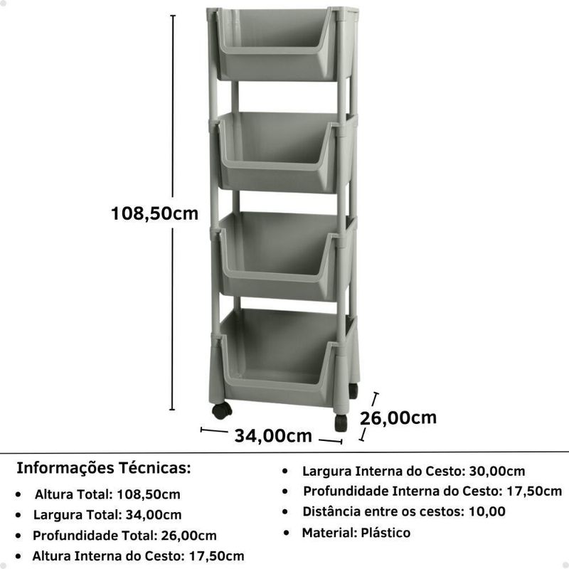 Especificações Técnicas:> Modelo: Carrinho Multi 4 Prateleiras em Plástico com Rodízio> Material: 100% Plástico> Altura Total: 108,50 (cm)> Altura Interna do Cesto: 17,50(cm)> Largura Interna do Cesto: 30,00 (cm)> Profundidade Interna do Cesto: 17,50 (cm)> Distância entre os cestos: 10,00(cm)> Largura Total: 34,00 (cm)> Profundidade Total: 26,00 (cm)