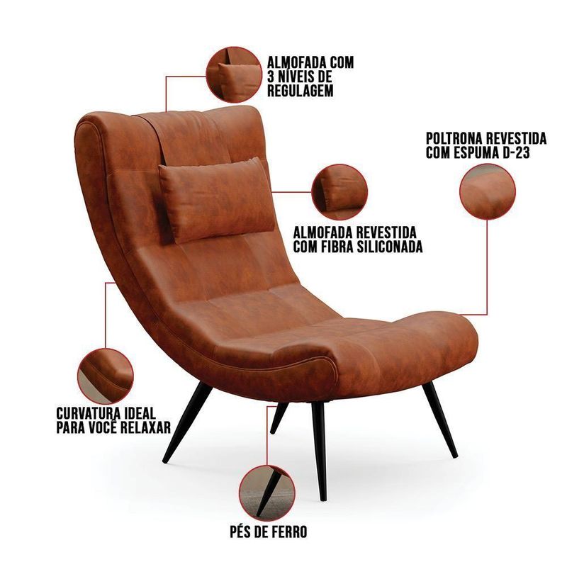 Uma Poltrona Confortável fabricada com espuma D-23 e madeira de eucalipto para garantir a qualidade, tecido sintético resistente e moderno, a Poltrona para Sala tem um lindo design e é levemente inclinada para maior conforto. Você pode ajustar a almofada de forma prática em três alturas, de acordo com a sua preferência. Os pés palito em ferro dão um toque retrô e sofisticado, sendo de 25cm os da frente e 30cm os de trás para maior estabilidade. Você pode aproveitar também e combinar com um puff para compor a decoração do seu ambiente.
