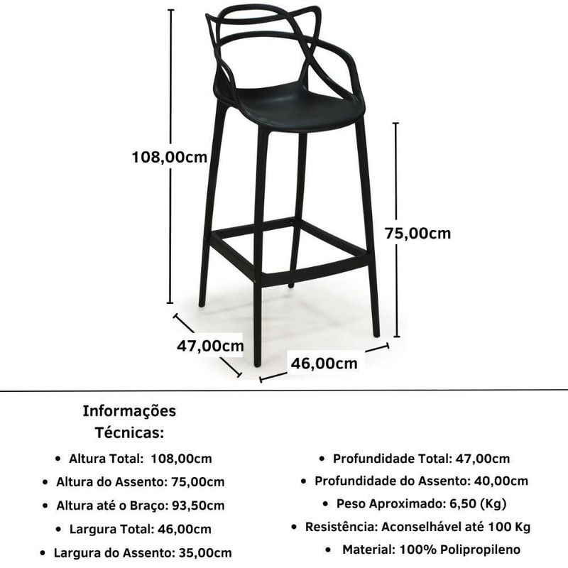 Especificações Técnicas do Produto:> Modelo: Banqueta Allegra> Material: 100% Polipropileno> Altura Total: 108,00 (cm)> Altura do Assento: 75,00 (cm)> Altura até o braço: 93,50 (cm)> Largura Total: 46,00 (cm)> Largura do Assento: 35,00 (cm)> Profundidade Total: 47,00 (cm)> Profundidade do Assento: 40,00 (cm)> Distância de um braço ou outro: 48,00 (cm)> Peso Aproximado: 6,50 (Kg)> Resistência: Aconselhável até 100 (Kg)> Acompanha Manual: Acompanha manual de montagem (não nos responsabilizamos pela montagem do produto).> Garantia: 03 Meses Contra Defeitos de Fabricação.