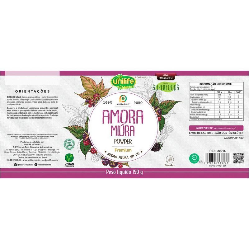 Amora Miura em Pó 150g UnilifeA Amora Miura em Pó Unilife é um versátil de alta qualidade, elaborado a partir da amora miura desidratada e moída. Este produto é ideal para quem busca uma opção prática e nutritiva para incorporar no dia a dia.Destaques do Produto:Qualidade Superior: Produzido com amoras miura selecionadas e submetidas a rigorosos controles de qualidade.Facilidade de Uso: Apresentado em pó, permitindo fácil adição a diversas receitas e bebidas.Ingredientes Naturais: Composto exclusivamente por amora miura em pó, garantindo pureza e integridade.Indicado para: Indivíduos que desejam complementar sua dieta com um produto natural e nutritivo.Sugestão de Uso: Adicionar 1 colher de chá (5g) do pó a sucos, vitaminas, iogurtes ou conforme sua preferência. Gestantes, lactantes e crianças menores de 3 anos devem consumir este produto sob orientação de um de saúde.Ingredientes: Amora miura em pó.Não contém glúten.Não contém lactose.Produto autorizado pela ANVISA anexo I da RDC 240/2018 conforme RDC 726/2022 da ANVISA AFE do MS