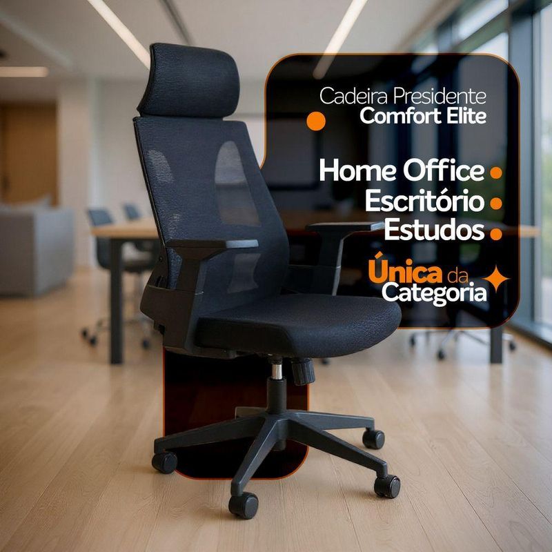 Cadeira Presidente Oficial Comfort Elite com Apoio de CabeçaConforto robusto, estrutura resistente e design executivo.A Comfort Elite é a escolha ideal para quem valoriza ergonomia, firmeza e qualidade nos mínimos detalhes. Com estrutura reforçada, assento de alta densidade e apoio de cabeça amplo, é perfeita para quem passa longos períodos trabalhando ou estudando.A inclinação sincronizada é um mecanismo presente em cadeiras e poltronas que permite ao usuário ajustar o encosto e o assento de forma simultânea, proporcionando maior conforto e ergonomia durante o uso. Esse tipo de reclinação é comumente encontrado em móveis de escritório, especialmente em cadeiras de trabalho, onde a postura correta é essencial para evitar dores e lesões musculares.O encosto é revestido em tecido Mesh Premium, composto por 64% de poli elastômero e 36% de poliéster. Já o assento conta com espuma 35D, revestida em tecido 100% poliéster.Atende aos requisitos da NR-17 além disso possui o cobiçado selo BIFMA de qualidade, garantindo durabilidade e desempenho excepcionais.Garantia de 2 anos!Destaques do Produto:Encosto de cabeça fixo revestido por mesh para acompanhar o design do encostoEstrutura do encosto em PP virgem com fibra, resistente e durável.Apoio lombar em PP preto, fixo, oferecendo suporte constante à coluna.