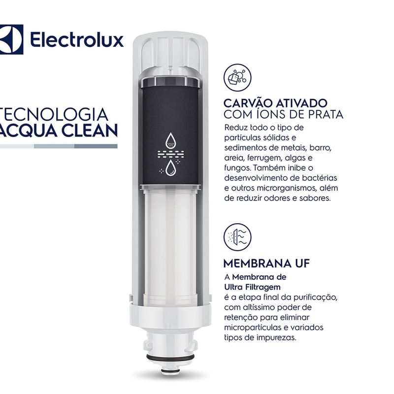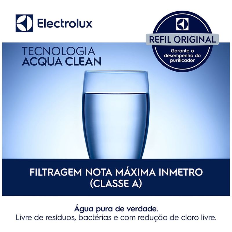 O Refil Original da Electrolux garante água pura e preserva sua saúde. Com a exclusiva Tecnologia Acqua Clean possui nota máxima na retenção de partículas pelo Inmetro (Classe A).