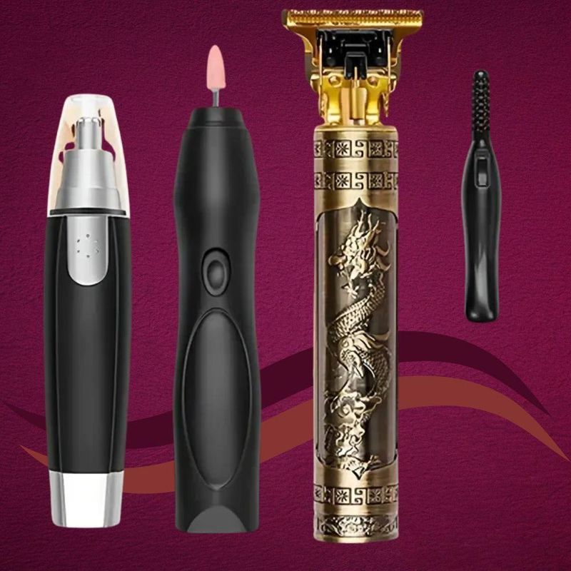 Eleve seu cuidado pessoal ao nível profissional com o Kit Máquina Dragão Dourada – o combo perfeito para quem busca precisão, versatilidade e estilo no dia a dia. Ideal para barba, cabelo, bigode e pelos em geral, esse kit é completo para uso doméstico ou em viagens.Com design moderno e acabamento dourado, a máquina T9 oferece potência, autonomia e praticidade em um só produto.Principais Benefícios:Corte Profissional em Casa – Aparador multifuncional ideal para barba, cabelo e pelos corporais.Cabeças Removíveis e Laváveis – Mais praticidade na higienização e troca de funções.Bateria Recarregável Sem Fio – Liberdade de uso com alta autonomia e sem depender de tomadas.Compacta e Portátil – Leve e fácil de transportar, perfeita para viagens e uso diário.Acessórios Inclusos:Vem com aparador, lixa, mini máquina para acabamentos, enrolador de cílios e mais.? 4 Pentes de Altura – Ajuste de corte personalizado para diferentes estilos.Especificações:Máquina Dragão Cabelo (carregador USB)Dimensões Aproximadas: 15,0X2,5X2,5cmAparador de pelos de Nariz (Funciona a Pilha AA - Não inclusa)Dimensões Aproximadas: 13,0X2,0X2,0cmLixa Elétrica para Unha (Funciona a Pilha AA - Não inclusa)Dimensões Aproximadas: 14,0X3,0X3,0cmModelador de Cílios (Funciona a Pilha AAA - Não inclusa)Dimensões Aproximadas: 9,0X2,0X2,0cmO Que Acompanha o Kit:1 Máquina Dragão Cabelo4 Pentes de corte (diferentes alturas)1 Aparador de pelos de Nariz1 Lixa Elétrica1 Modelador de cílios1 Cabo de carregamento USB