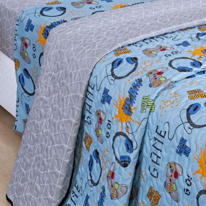Kit 5 Peças Fantasy = Colcha Solteiro Infantil + Jogo De Lençol - Games Azul