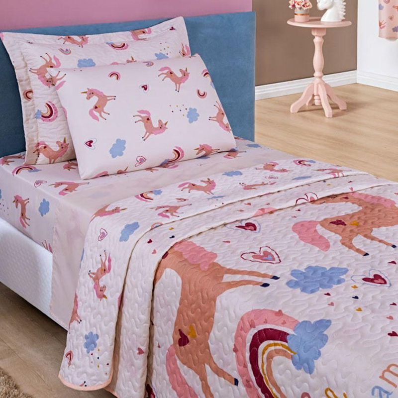 Kit 5 Peças Fantasy = Colcha Solteiro Infantil + Jogo De Lençol - Unicórnio Rosa