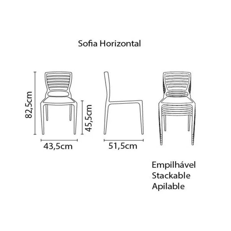 CADEIRA SOFIA GRAFITE TRAMONTINAINFORMAÇÕES DO PRODUTOCadeira Sofia Grafite TramontinaCadeira Sofia Grafite Tramontina é um produto diferenciado no mercado devido a sua qualidade do produto bem como seu excelente custo/benefício.Se você procura um produto bonito, resistente e de alta qualidade com um excelente custo/benefício você acabou de encontrar tudo isso na Cadeira Sofia Grafite Tramontina.A Cadeira Sofia Grafite Tramontina é fabricada em polipropileno e fibra de vidro, o que a torna uma cadeira muito resistente sem perder seu design moderno que combina em qualquer ambiente.CADEIRA SOFIA GRAFITE TRAMONTINA É BOA?A Cadeira Sofia Grafite Tramontina é excelente! Por conta de seu design diferenciado das demais cadeiras do mercado faz da Cadeira Sofia Grafite Tramontina um produto que combina em todos ambientes, tanto em salas de jantar, cozinhas, quiosques, padarias, bares, restaurantes, dentre todos os outros segmentos do mercado. E é claro combina perfeitamente com a sua casa.CADEIRA SOFIA GRAFITE TRAMONTINA - MEDIDASAltura total da Cadeira 82,5 cmLargura total da Cadeira 43,5 cmProfundidade total da Cadeira 51,5 cmAltura do chão até o assento 45,5 cm CADEIRA SOFIA GRAFITE TRAMONTINA - MATERIALA Cadeira Sofia Grafite Tramontina é feita de polipropileno e fibra de vidro.PORQUE VOCÊ DEVE COMPRAR A CADEIRA SOFIA GRAFITE TRAMONTINACombina com todos ambientes.Cadeira firme e resistente.Ótima qualidade de acabamento.Perfeita para casas e comércio.Cadeira leve e empilhável.Aguenta a uma carga de até 182 kg.CADEIRA SOFIA GRAFITE TRAMONTINA - CUIDADOSA Tramontina recomenda que o uso da Cadeira Sofia Grafite Tramontina seja feito em ambientes internos de preferência. Não subir com os pés na cadeira e jamais apoiar-se em apenas duas pernas da cadeira. De preferência não deixe a cadeira por longos períodos no sol.CADEIRA SOFIA GRAFITE TRAMONTINA - LIMPEZAA limpeza da Cadeira Sofia Grafite Tramontina é bem simples, basta apenas um pano umidecido com água.