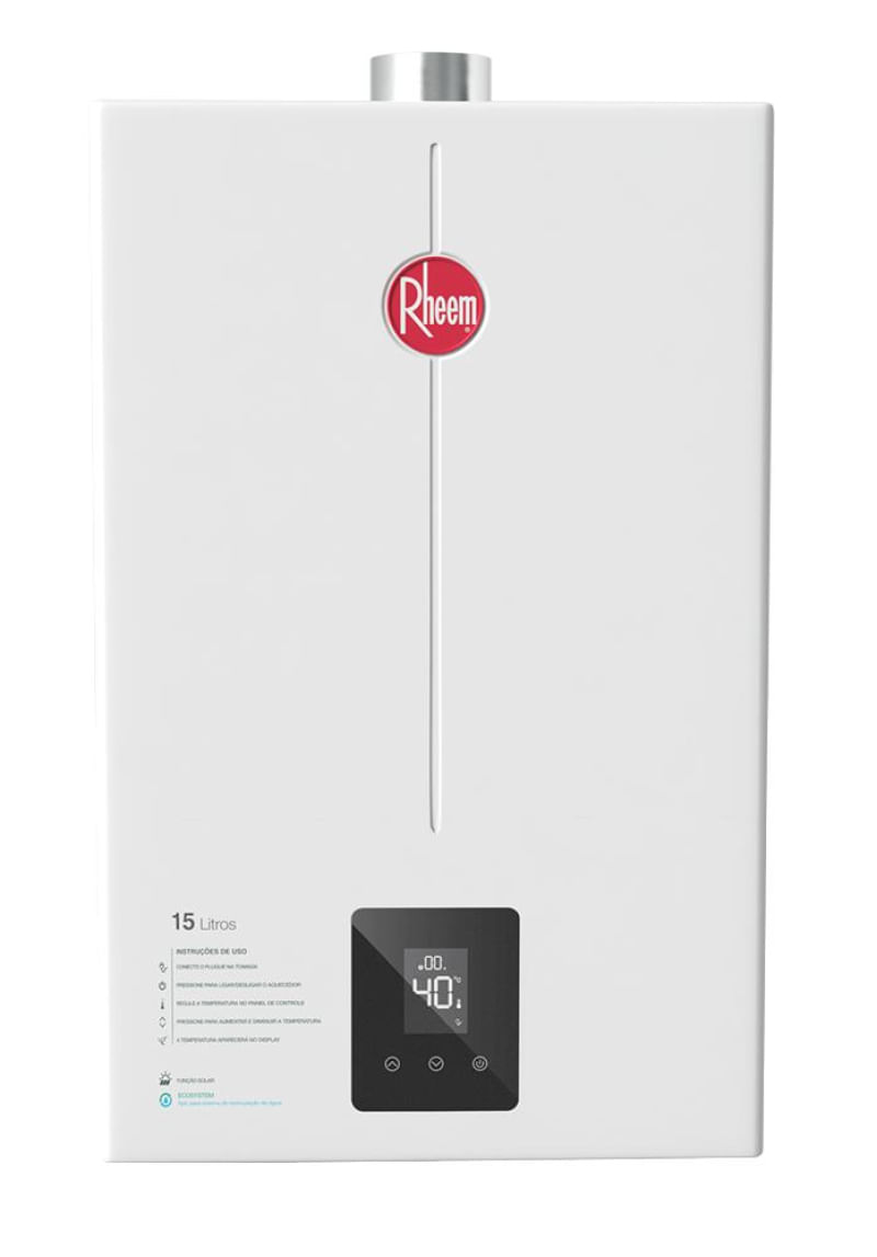 A linha de aquecedores de passagem digitais da Rheem são reconhecidos pela sua alta tecnologia.O aquecedor de passagem a gás Rheem de 15 litros GN é a opção ideal para uso residencial e comercial.Atende 2 pontos de consumo simultaneamente, 2 duchas de 8 l/min, conta com opção inverno/verão com ajuste de fluxo de água conforme a demanda e a estação do ano. Importante: Antes de adquirir seu equipamento, tenha certeza de que sua estrutura de água e gás são compatíveis com o a capacidade do aparelho que está sendo adquirido.