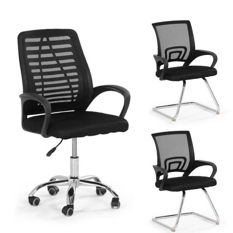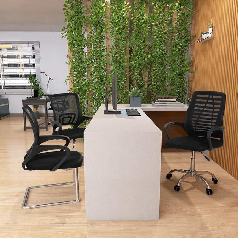 O Conjunto é composto por uma Cadeira de Escritório Base Giratória, a qual conta com braços, encosto em tela mesh, altura ajustável e uma base giratória com rodinhas, a qual facilita consideravelmente a sua navegabilidade na mesa de trabalho. E também 2 Cadeiras de Escritório Secretária Base Fixa, kit ideal para ser utilizado em consultórios, clínicas e escritórios!