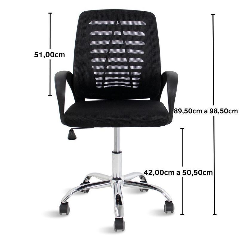 Dimensões Cadeira de Escritório Base Giratória:> Altura da Cadeira(cm): 89,50 à 98,50> Altura do Encosto(cm): 51,00> Altura do Chão ao Assento(cm): 42,00 à 50,50> Largura do Assento(cm): 47,50> Profundidade do Assento(cm): 48,00> Largura Braço a Braço: 60,00