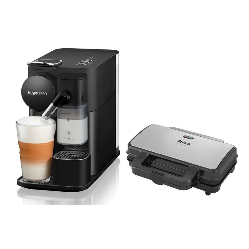 Kit Café da Manhã: Máquina de Café Nespresso Lattissima One Preta F121 e Grill e Sanduicheira Philco Inox PGR021