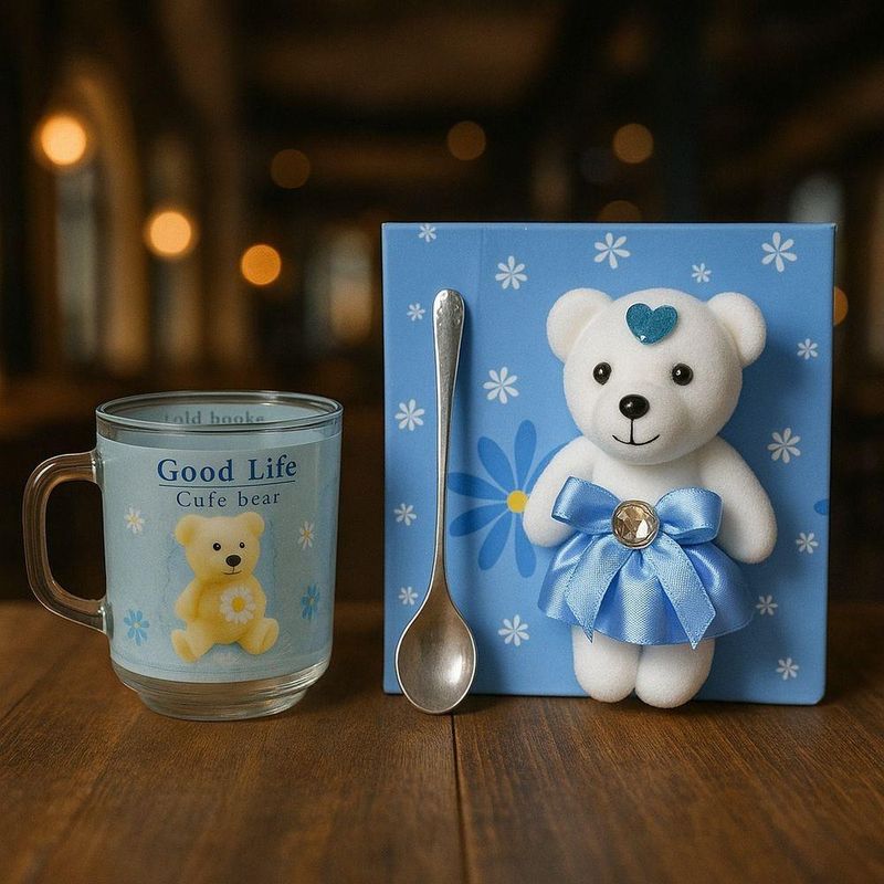 Kit Caneca Presente Ursinho E Colher + Urso De Pelucia Azul