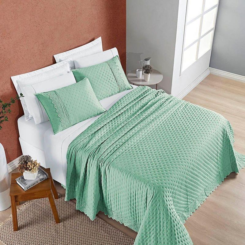 Kit Cobre Leito Colcha Bouclê King Laise Bordada Micropercal 200 Fios 3 Peças - Verde Salvia - 100% Poliéster